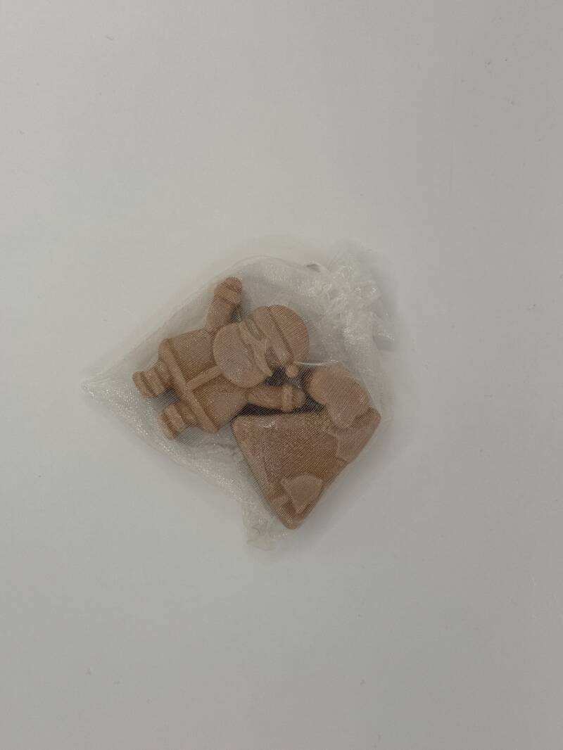 Rechts: een zakje met 2 kerstfiguren in geur Muffin met vanille